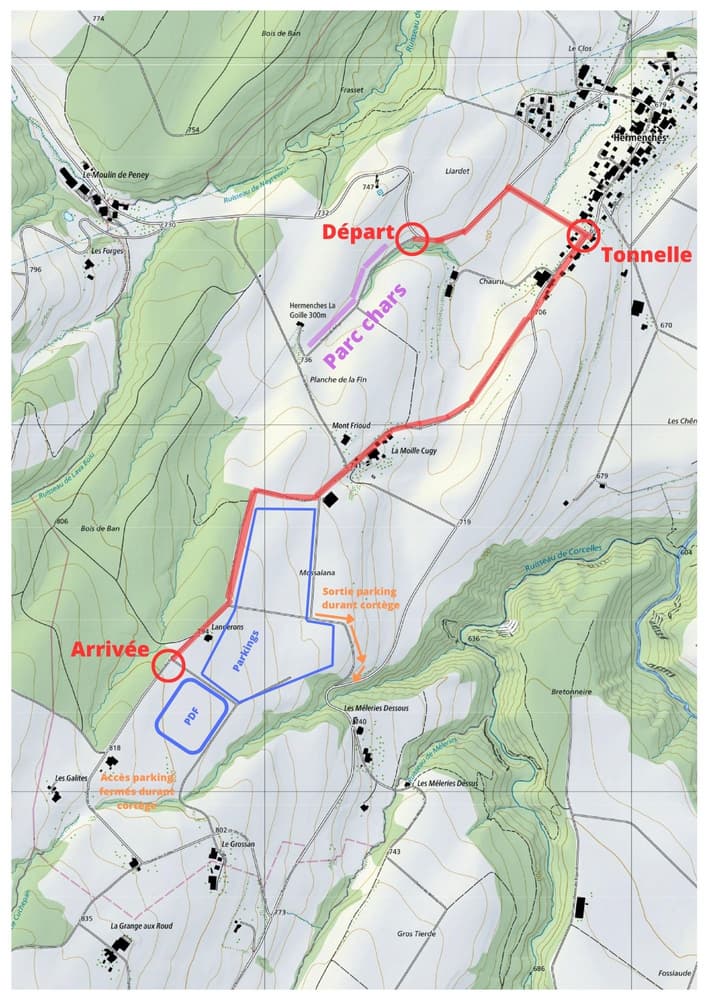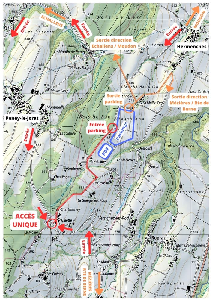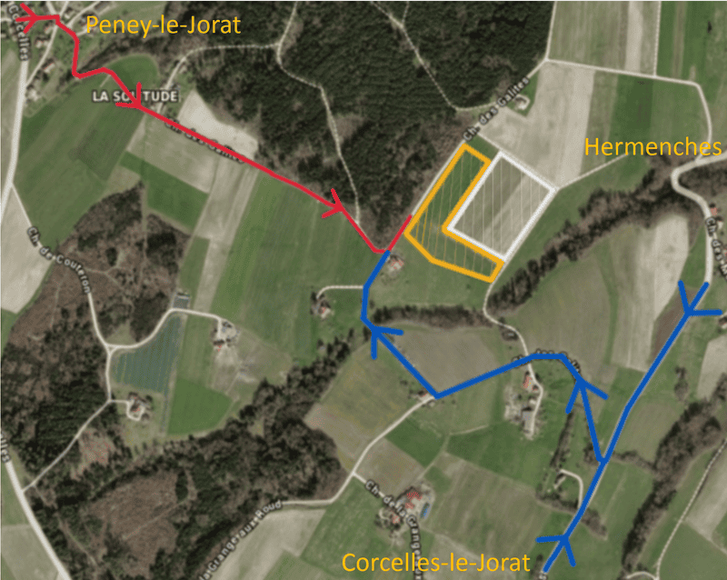 - – En bleu: Accès depuis Hermenches et Corcelles-le-Jorat :